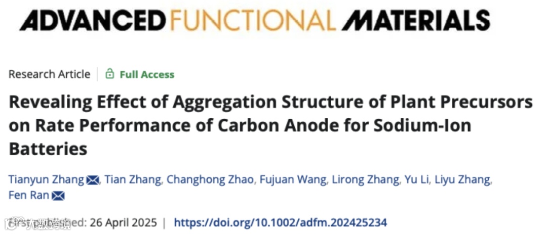 基于此,来自兰州理工大学张天芸副教授和冉奋教授团队的硕士研究生张田在国际知名期刊Advanced Functional Materials上发表题为“Revealing Effect of Aggregation Structure of Plant Precursors on Rate Performance of Carbon Anode for Sodium-ion Batteries”的研究文章。该文章研究了由植物基前驱体组成(纤维素、半纤维素和木质素)和聚集态结构引发的衍生碳负极倍率性能变化,同时提出部分过渡金属能够对前驱体聚集态结构修复,从而提高衍生碳负极倍率性能。