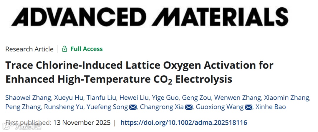 近日,来自中国科学院大连化学物理研究所包信和院士、汪国雄教授(国家杰青;现已加入复旦大学)、宋月锋副研究员团队联合中国科学技术大学夏长荣教授在Advanced Materials期刊发表题为“Trace Chlorine−Induced Lattice Oxygen Activation for Enhanced High−Temperature CO2 Electrolysis”的研究论文,中科院大连化物所张少威、佐治亚理工学院胡学禹为论文共同第一作者,汪国雄、夏长荣和宋月锋为论文共同通讯作者。