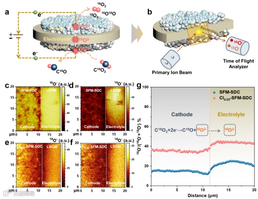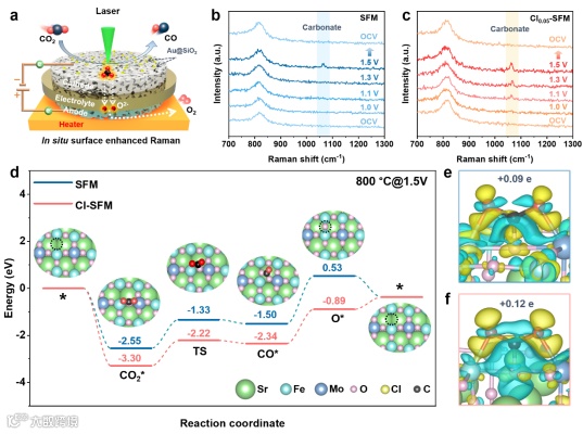 被激活的晶格氧不仅提高材料对CO2的吸附能力,更可与CO2形成碳酸盐型中间体(CO₃2−),这是CO2电化学还原的关键路径。原位表面增强拉曼光谱(SERS)监测显示,在施加偏压后Cl−掺杂样品迅速出现~1070 cm−1的碳酸根特征峰,并随着电压升高增强,表明反应中间态生成更早、浓度更高。进一步,C18O2同位素示踪与飞行时间二次离子质谱(ToF−SIMS)联合分析表明,Cl0.05–SFM阴极在同样条件下形成更多18O−信号,说明其对CO2中氧的解离利用效率更高,CO2在表面被有效活化并转化为反应物种。理论CI−NEB路径分析揭示:在Cl−掺杂体系中,CO2吸附能从−2.55 eV提升−3.30 eV,脱附能屏障从2.03 eV降低至1.45 eV,中间态分解速率提升近10倍。这说明Cl−诱导的晶格氧激活,不仅增强CO2吸附,还显著加快了电解还原的动力学过程。