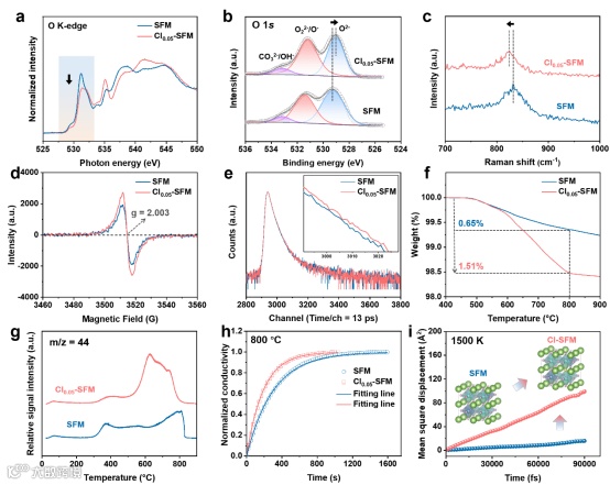 弱化金属–氧键不仅释放晶格氧,还促进氧空位的形成。电子顺磁共振(EPR)测试显示Cl−掺杂样品中未成对电子信号增强,正电子湮灭谱(PALS)揭示氧空位由集聚态向分散态转化,说明结构缺陷被更有效地激活和分布。在热重分析(TGA)中,Cl−掺杂样品高温失重增多,进一步证明其氧可逆性更强。在传输层面,电导弛豫(ECR)实验证实Cl0.05–SFM的表观氧表面交换系数(kchem)和氧体扩散系数(Dchem)分别提升75.7%和86.7%。AIMD分子动力学模拟也表明O2−在晶格中的均方位移大幅提升,扩散系数提高超过一倍。这一系列结果表明:Cl−掺杂不仅创造了更多氧空位,也提升了O2−在晶体结构内的长程迁移能力,是加快CO2电解反应进程的核心动力来源。
