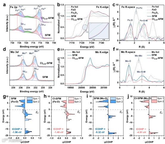 本研究提出在SFM钙钛矿中以微量氯离子(Cl−)替代部分氧离子(O2−),构建钙钛矿氧氯化物(Cl0.05–SFM)。得益于Cl−更大的离子半径和更高极化率,其掺杂打破了原有的强Fe–O/Mo–O共价键,XPS和XANES光谱显示金属氧化态降低,COHP计算和PDOS分析进一步揭示了d–p轨道杂化程度减弱。这种“共价软化”使晶格氧的束缚能下降,氧更容易参与界面反应,从而为CO2电化学转化提供活性氧源,是整个材料体系反应性能提升的根本起点。