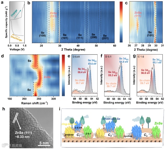 图4. 水系Zn-Se电池的储能机理,揭示了环状Se,链状Se和ZnSe的转化机制。