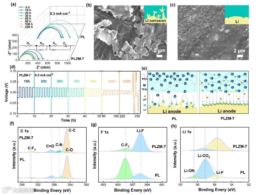 图6.(a)PL和PLZM-7的Li||Li对称电池在60 °C,0.3 mA cm–2,0.3 mA h cm–2下的EIS演变;PL(b)与PLZM-7(c)的Li||Li对称电池循环50 h后锂金属负极的SEM;(d)PLZM-7的Li||Li对称电池在0.3 mA cm–2下循环220 h的沉积/剥离电压曲线; PL和PLZM-7的Li||Li对称电池锂沉积行为的机理示意图(e)和(f-h)循环后锂负极表面C 1s、F 1s和Li 1s的XPS谱。