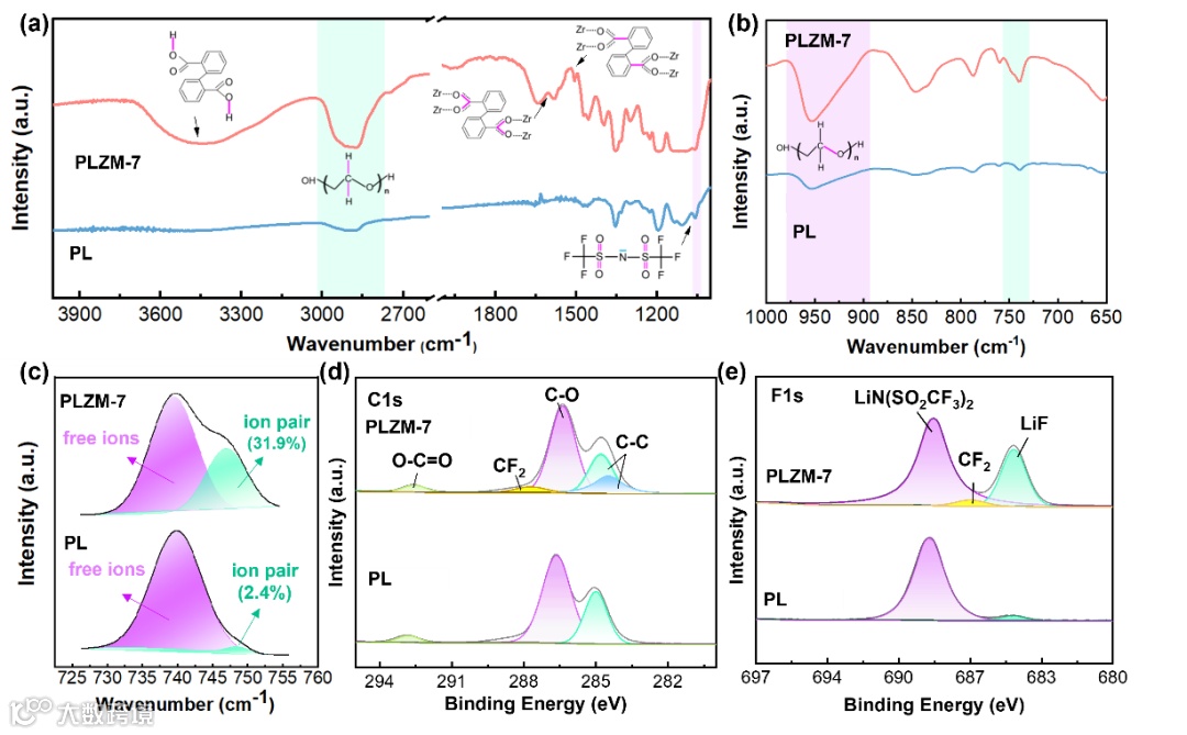 图3.(a)PL及PLZM-7在1000-4000 cm–1、(b)650-1000 cm–1及(c)650-720 cm–1处的FT-IR光谱;(d)PL与PLZM-7的C1s和(e)F1s 的XPS图谱。