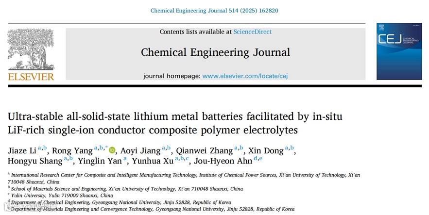 基于此,来自西安理工大学材料学院新型微观结构复合材料的可控制备和先进能量转换存储器件创新团队杨蓉教授,在国际知名期刊Chemical Engineering Journal上发表题为“Ultra-stable all-solid-state lithium metal batteries facilitated by in-situ LiF-rich single-ion conductor composite polymer electrolytes”的研究文章。该研究提出了一种原位富LiF单离子导体的复合固态电解质设计策略来提高电解质/锂负极界面稳定性。突破传统锂负极表面LiF研究的局限,从固态电解质体相结构出发,阐明TFSI–-LiF转化机制及对锂金属负极的稳定效应,有望为复合固态电解质在ASSLMBs中的实用化设计提供有价值的指导。