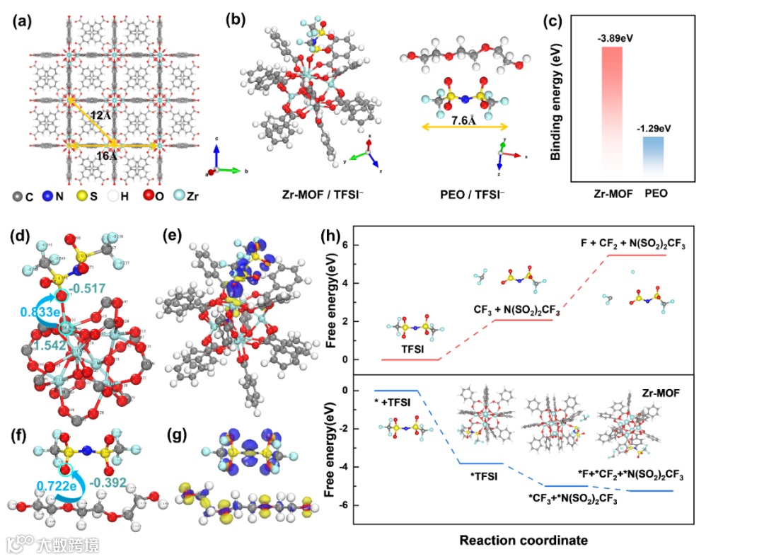 图4.(a)Zr-MOF的晶体结构;(b)Zr-MOF/TFSI–和PEO/TFSI–的结构;(c)Zr-MOF/TFSI–和PEO/TFSI–的结合能;(d,f)Zr-MOF/TFSI–和PEO/TFSI–的电荷转移;(e,g)Zr-MOF/TFSI–和PEO/TFSI–的差分电荷密度;(h)TFSI–被Zr-MOF吸附前后的分解过程吉布斯自由能图,插图为不同阶段的分解产物。