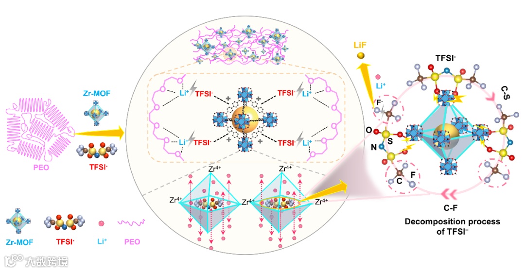 图1. 复合固态电解质中Zr-MOF与PEO及TFSI–的相互作用及其与LiF转化过程的示意图。
