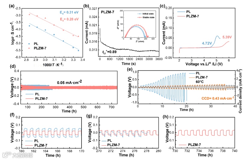 要点三:PLZM-7 复合固态电解质的Li+传输性能和对锂稳定性
