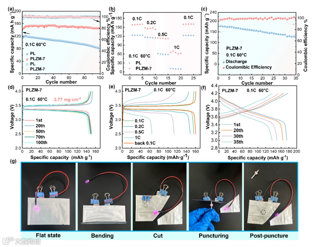 图7. LFP|PL|Li和LFP|PLZM-7|Li电池在0.1 C倍率下的(a)长循环性能和(b)倍率性能;(c)NCM811|PLZM-7|Li电池在0.1 C倍率下的循环稳定性;(d)LFP|PLZM-7|Li电池在0.1 C下不同循环圈数的电压曲线;(e)LFP|PLZM-7|Li电池在不同倍率下的充放电曲线;(f)NCM811|PLZM-7|Li电池在0.1 C倍率下的充放电曲线;(g)LFP|PLZM-7|Li软包电池在极端环境下的安全测试。