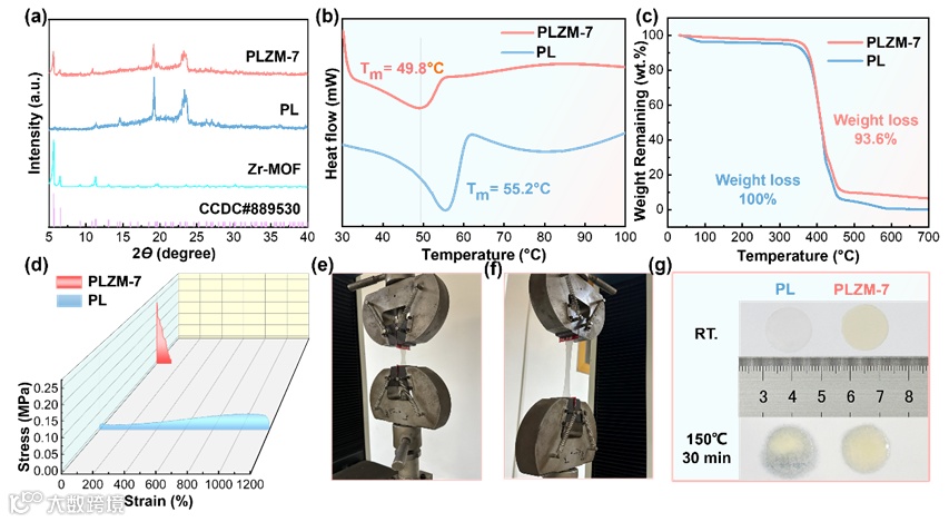 图2.(a)Zr-MOF、PL及PLZM-7的XRD图谱; PL与PLZM-7的(b)DSC曲线,(c)TGA曲线以及拉伸测试的(d)应力-应变曲线;(e,f)PLZM-7拉伸前、后的数码照片;(g)PL与PLZM-7的热收缩测试。