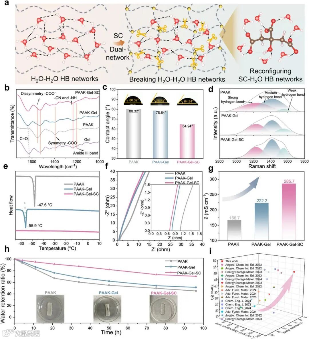 图3. a)双网络结构和SC共介导的氢键网络的示意图。B)三种水凝胶的FT-IR。c)水接触角测试。d)拉曼光谱。e)DSC。(f)环境影响报告书。g)离子电导率。h)当暴露于空气时液体保持性能的变化。i)离子电导率和液体保留性质与先前报道的文献的比较。
