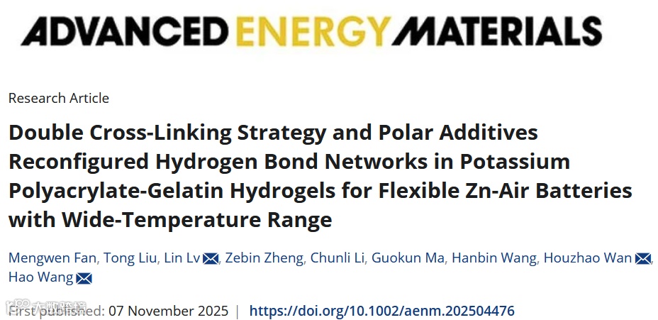 近日,来自湖北大学的王浩教授、万厚钊教授、吕琳副教授,在国际权威期刊Advanced Energy Materials上发表题为“Double Cross-Linking Strategy and Polar Additives Reconfigured Hydrogen Bond Networks in Potassium Polyacrylate-Gelatin Hydrogels for Flexible Zn-Air Batteries with Wide-Temperature Range”的研究文章。该研究将强极性柠檬酸盐掺入PAAK-Gel的双网络结构中重构了三元杂化水凝胶的氢键网络,赋予具有PAAK-Gel-SC三元水凝胶的FZAB在宽温度范围内具有优异的界面稳定性和可操作性。