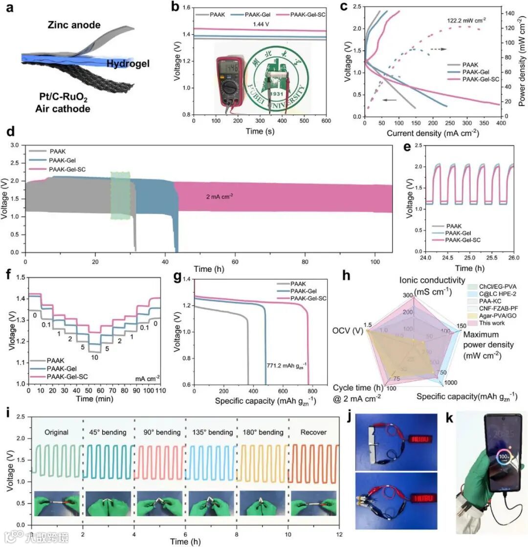 基于PAAK-Gel-SC水凝胶组装的柔性锌空气电池展现出: