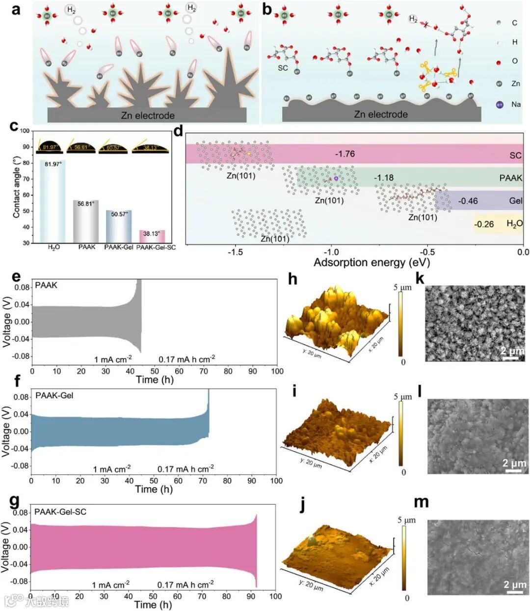 图4. a)FZAB水凝胶电解质中锌枝晶生长和其它副反应的示意图。B)SC添加剂抑制锌枝晶生长的原理示意图。c)锌板与H2O、PAAK、PAAK-Gel和PAAK-Gel-SC之间的接触角。d)H2O、Gel、PAAK和SC与Zn(101)晶面的吸附能。e-g)用三种水凝胶电解质组装的对称电池在1 mA cm-2下的充电-放电循环。h-j)循环后锌板的AFM图像。k-m)循环后锌板的SEM图像。