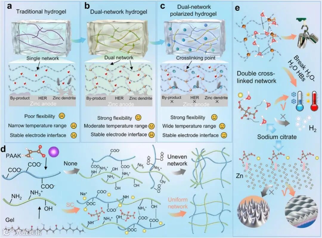 图1. a)传统的单网络水凝胶。B)双网络水凝胶。c)使用三元杂化水凝胶的Zn沉积的示意图和副反应的抑制机制。d)SC调节PAAK-Gel内部网络的示意图。e)双交联网络和SC的共同介导机制图。