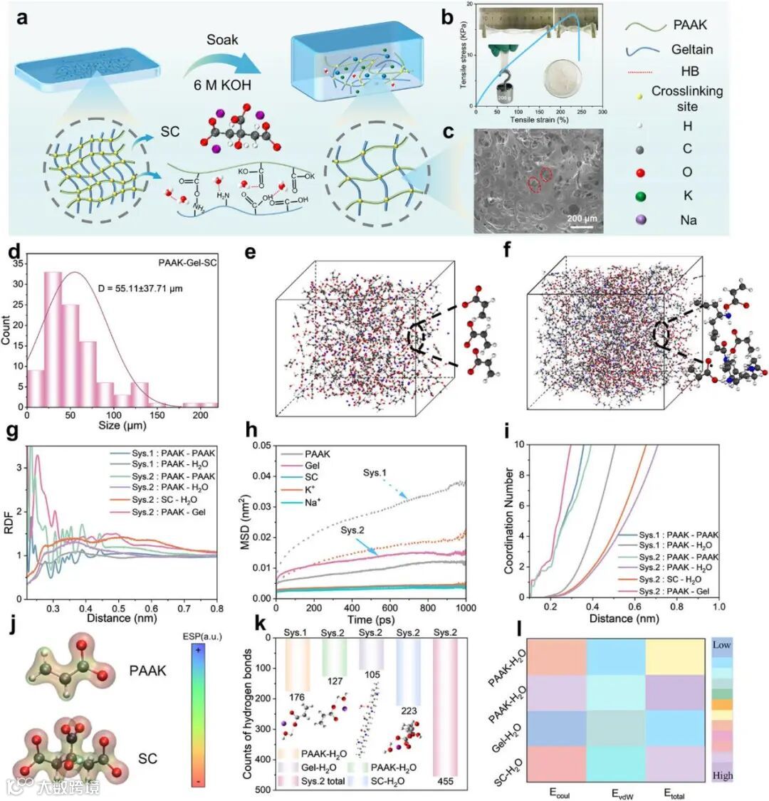 图2. a)吸收KOH后PAAK-Gel-SC水凝胶内部网络的变化。B)拉伸、塑性和应力-应变。c)PAAK-凝胶-SC的SEM图像。d)孔径分析。e,f)系统1 PAAK和系统2 PAAK-Gel-SC的MD模拟。g)系统1和系统2中每个组分的COM-RDF。h)MSD。i)每个组件的协调编号。j)PAAK和SC的静电势。k)H2O和体系1和体系2中各组分形成的氢键数。l)相互作用能。
