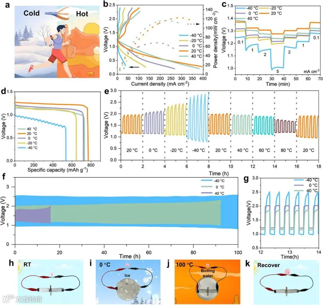 图6. 凝胶电解质在宽温度范围内的电化学性能。a)FZAB在宽温度范围内工作的示意图。B)极化曲线和功率密度曲线。c)速率曲线。(d)比容量。e)FZAB在不同温度下的充电和放电曲线。f)在不同温度下,FZAB的长期循环性能,电流密度为2 mA cm−2,每次循环20 min。g)FZAB从12至14小时的充电-放电曲线。h-k)在h)室温、i)0 °C、j)100 °C和k)恢复至室温下用PAAK-Gel-SC水凝胶组装的FZAB为LED灯泡供电。