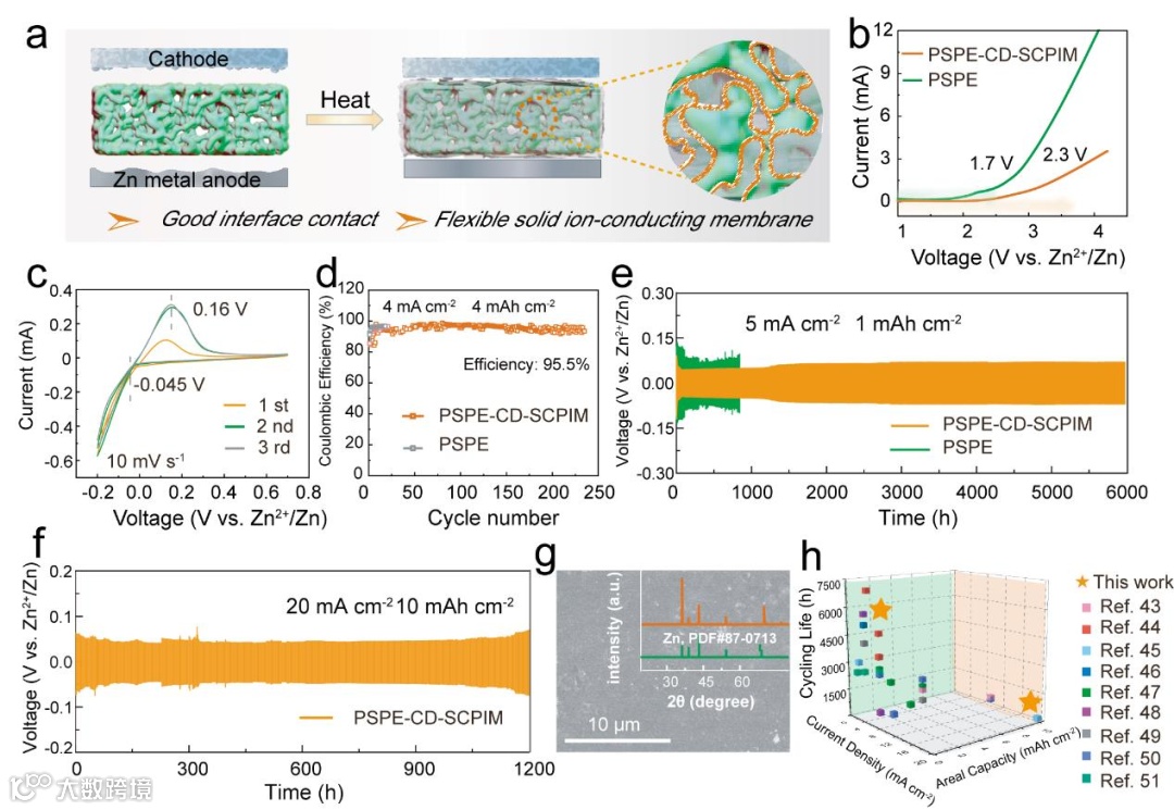 Figure 3. a) Schematic illustration of the interface contact improvement mechanism in PSPE-CD-SCPIM, highlighting the enhanced electrode-electrolyte compatibility. b) LSV curves of PSPE-CD-SCPIM and PSPE, demonstrating the electrochemical stability window of the electrolytes. c) CV curves of the Zn//Cu asymmetric battery, illustrating the Zn deposition/stripping behavior. d) Cycle performance of the Zn//Cu asymmetric battery, illustrating the Zn deposition/stripping behavior. e) Long-term cycling performance of Zn//Zn symmetric batteries assembled with PSPE-CD-SCPIM and PSPE at a current density of 5 mA cm-2 and an areal capacity of 1 mAh cm-2. f) Extended cycling performance of Zn//Zn symmetric batteries assembled with PSPE-CD-SCPIM at a high current density of 20 mA cm-2 and an areal capacity of 10 mAh cm-2. g) SEM image and XRD pattern of the Zn anode after 100 cycles of plating/stripping at 5 mA cm-2, demonstrating the stability and uniformity of Zn deposition. h) Comparative analysis of the electrochemical performance of Zn//Zn symmetric batteries in this work with other reported zinc-ion batteries, highlighting the superior cycling stability and performance of PSPE-CD-SCPIM.