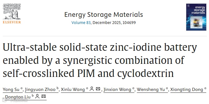 近日,来自长春理工大学的王昕璐副教授与东北师范大学的刘东涛教授合作,在国际知名期刊《Energy Storage Materials》上发表题为“Ultra-Stable Solid-State Zinc-Iodine Battery Enabled by a Synergistic Combination of Self-Crosslinked PIM and Cyclodextrin”的研究论文。该研究针对固态锌碘电池中锌枝晶生长、多碘化物穿梭效应及固态电解质离子电导率低等关键问题,创新性地开发了一种基于热自交联聚合物与环糊精协同作用的高性能复合固态电解质。该电解质通过构建稳定的离子传输通道并增强界面接触,显著提升了锌离子迁移数与离子电导率,实现了锌对称电池超过6000小时的稳定循环和全电池在1C倍率下20000次循环的超长寿命。本研究为解决固态电池中常见的界面不稳定与离子传输难题提供了新的材料设计策略,推动了高性能固态锌基电池的发展。