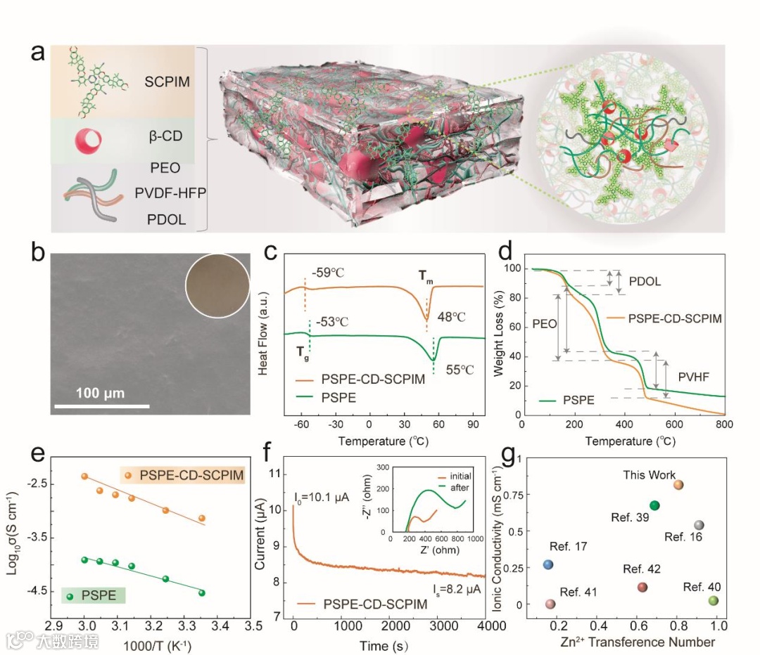 Figure 2. a) Schematic illustration of the collaborative design strategy combining non-covalent anchoring and framework confinement, enabling PSPE-CD-SCPIM to achieve superior ionic conductivity. b) SEM images and optical photographs of PSPE-CD-SCPIM, highlighting its structural morphology and flexibility. c) DSC curves of PSPE-CD-SCPIM and PSPE, demonstrating the effect of SCPIM and β-CD on the thermal properties of the electrolyte. d) TGA curves of PSPE-CD-SCPIM and PSPE, illustrating their thermal stability and decomposition behavior. e) Arrhenius plots of ionic conductivity for PSPE-CD-SCPIM and PSPE, revealing the temperature-dependent ion transport kinetics. f) Chronoamperometry curve of PSPE-CD-SCPIM, with inset showing the EIS before and after polarization, highlighting the Zn2+ transference number. g) Comparative analysis of PSPE-CD-SCPIM with other reported SPEs in terms of Zn2+ transference number and ionic conductivity, underscoring its superior performance.