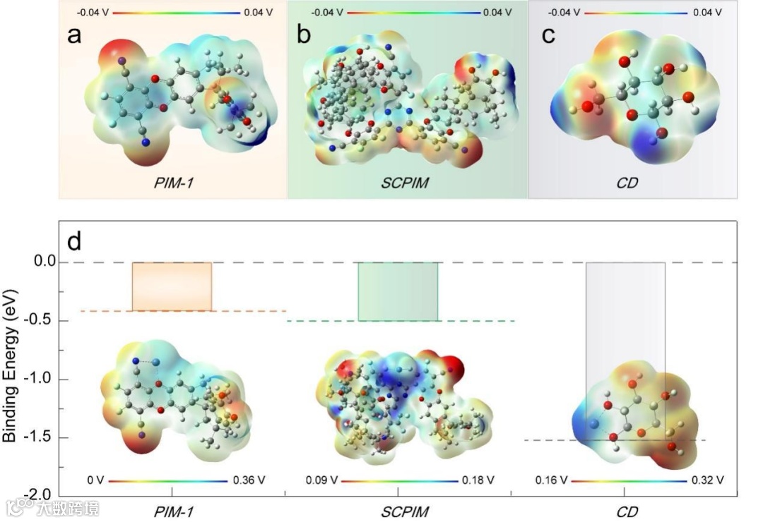 Figure 4. a) Electrostatic potential map of PIM-1, illustrating the charge distribution and potential energy landscape across the polymer framework. b) Electrostatic potential map of SCPIM, highlighting the enhanced charge distribution and structural stability achieved through thermal crosslinking. c) Electrostatic potential map of β-CD, depicting the charge distribution and potential binding sites for Zn2+ within its cavity-rich structure. d) Electrostatic potential map of β-CD, depicting the charge distribution and potential binding sites for Zn2+ within its cavity-rich structure.