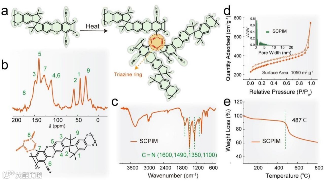 Figure 1. a) Schematic illustration of the synthesis of SCPIM via thermal self-crosslinking of PIM-1. b) Solid-state NMR spectra of SCPIM, confirming the structural integrity and crosslinking efficiency. c) FTIR spectra of SCPIM, highlighting the characteristic vibrational modes and functional groups. d) Nitrogen adsorption-desorption isotherms of SCPIM, demonstrating its porous structure and specific surface area. e) Thermogravimetric analysis (TGA) curve of SCPIM, illustrating its thermal stability and decomposition behavior.