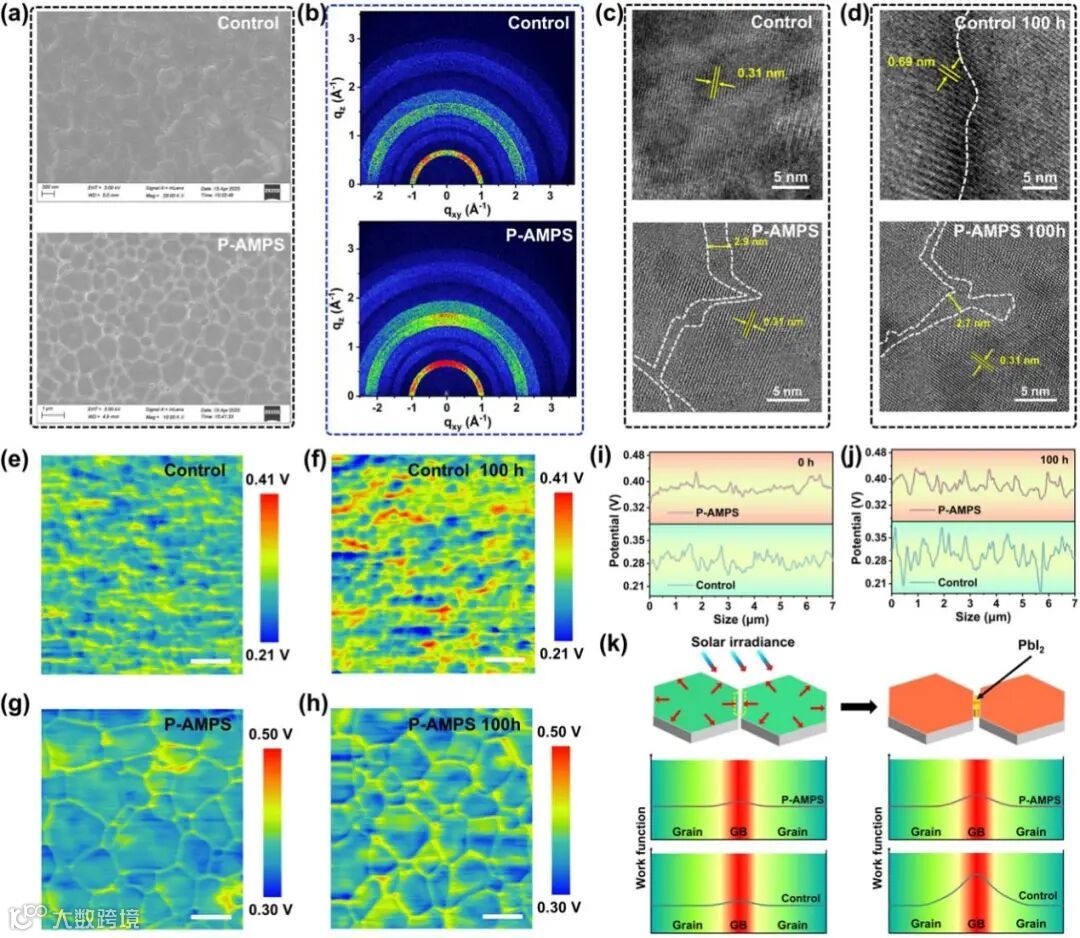 图2. (a)未修饰与P-AMPS修饰钙钛矿薄膜的SEM图。(b)未修饰与P-AMPS修饰钙钛矿薄膜的二维GIWAXS图。(c)光照前与(d)光照后未修饰与P-AMPS修饰薄膜的HR-TEM图。(e)未修饰与(f)P-AMPS修饰的钙钛矿薄膜的KPFM表面电势图。光照后(g)未修饰与(h)P-AMPS修饰的钙钛矿薄膜的KPFM表面电势图。比例尺1 μm。(i)光照前与光照后(j)后样品的CPD剖面比较。(k) 钙钛矿薄膜光照下结构演化机理示意图。