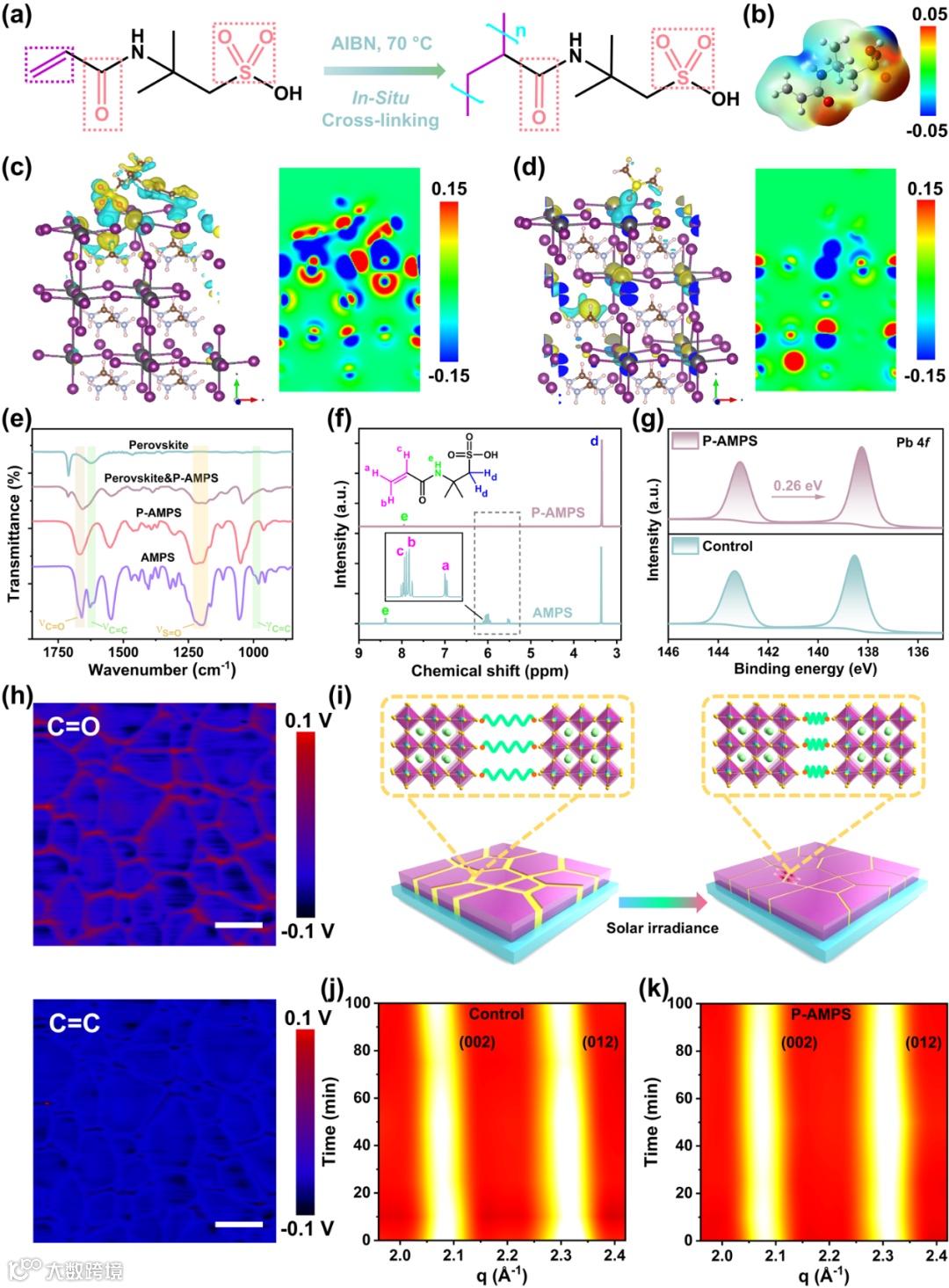图1. (a)AMPS在钙钛矿薄膜退火过程中原位聚合生成P-AMPS的示意图。(b)由Gaussian计算得到的AMPS静电势分布(ESP)。通过VASP计算的(c) AMPS与FAPbI3及(d)DMSO与FAPbI3的差分电荷密度图。(e)FTIR光谱显示AMPS与P-AMPS聚合前后及与钙钛矿作用后的特征变化。(f)AMPS聚合前后的1H NMR谱。(g)原位聚合前后钙钛矿薄膜的XPS分析。(h)原位聚合后薄膜表面C=O和C=C基团的AFM-FTIR图像(信号越强表明基团密度越高),比例尺1 μm。(i)示意图说明P-AMPS缓解钙钛矿晶格膨胀的机制。(j)原位GIWAXS测量未修饰与(k)P-AMPS修饰薄膜在光照下(002)和(012)晶面的衍射矢量位移变化。
