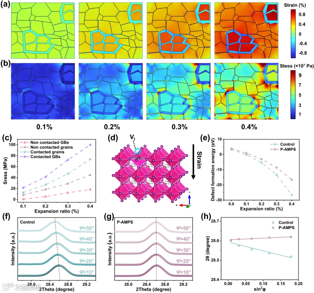 图3. (a)不同晶格膨胀率下多晶钙钛矿薄膜的应变分布模拟.(b)应力分布显示非隔离结构中晶界存在明显应力集中。(c)不同膨胀率下薄膜平均应力的定量分析。(d)FAPbI3在单轴应变作用下的结构模型。(e)不同应变条件下有无P-AMPS修饰时VI缺陷形成能的比较。(f)未含与(g)含P-AMPS薄膜的GIXRD图谱。(h)引入P-AMPS前后GIXRD的2θ–sin2ψ线性拟合结果。