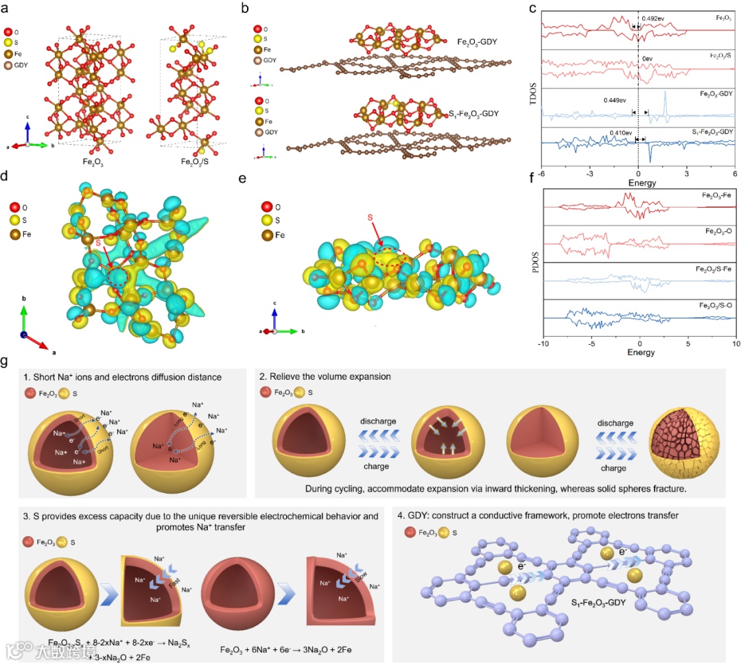 通过简便的水热-硫化法成功合成了分散在少层GDY上的表面S掺杂Fe2O3微中空颗粒(S-Fe2O3-GDY)。在水热过程中,Fe3+被吸附并富集在具有最负静电势的石墨炔三角形区域。随后经过结晶、成核和奥斯瓦尔德熟化过程,在GDY片表面均匀锚定形成独特的微米中空结构Fe2O3纳米颗粒,经硫化处理后最终获得目标材料S-Fe2O3-GDY。纳米颗粒的均匀分布使其能够直接接触电解质,增大了电极-电解质界面面积,结合独特的微米中空结构有效缩短了钠离子扩散路径并缓解体积膨胀。此外,表面硫掺杂不仅通过其独特的可逆电化学行为提供额外容量,同时增强了材料的结构稳定性并促进电子传输,与GDY优异的导电特性协同构建了高效导电网络。