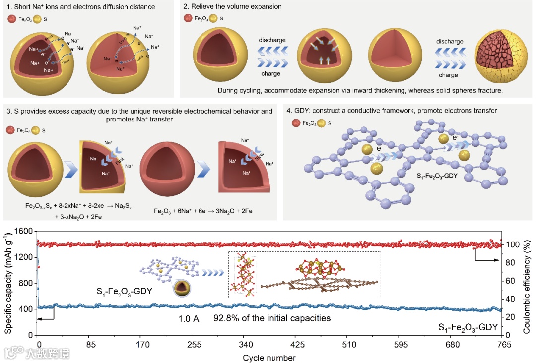 图1. S1-Fe2O3-GDY作为钠离子电池负极材料的优势以及S1-Fe2O3-GDY在1.0 A g-1电流密度下的长循环稳定性