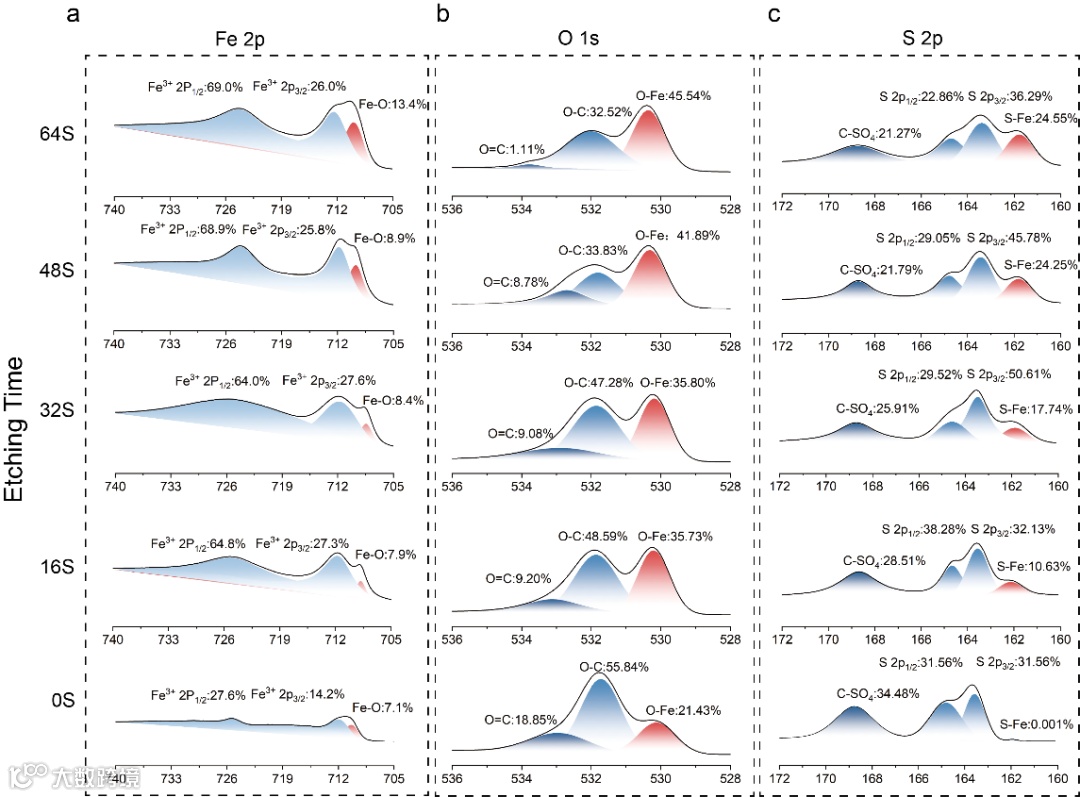 图4. S1-Fe2O3-GDY刻蚀XPS图谱:Fe 2p (a)、O 1s (b)、S 2p (c)