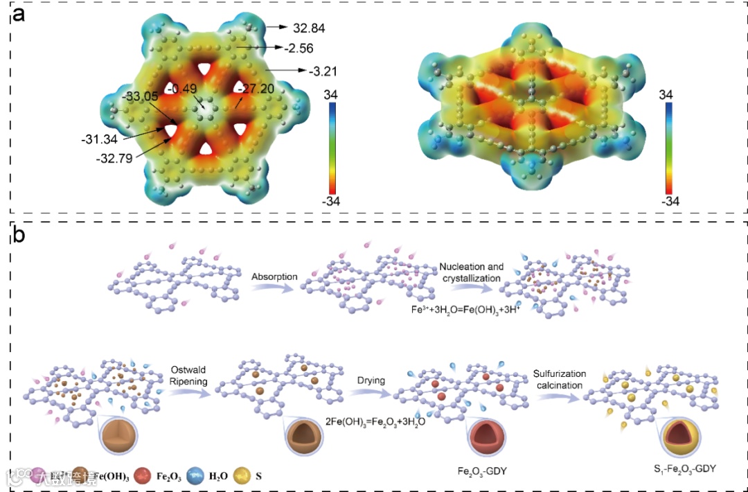 图1. (a) GDY表面静电势(ESP)计算结果示意图,其中蓝色代表正电势区域,红色代表负电势区域。(b) S1-Fe2O3-GDY材料制备过程示意图