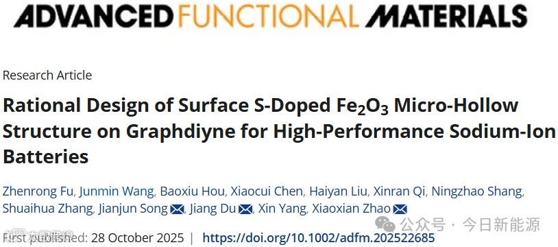 近日,来自河北农业大学的赵孝先教授与郑州大学杜江教授,青岛大学宋建军教授团队合作,在国际顶级材料科学期刊《Advanced Functional Materials》上发表题为“Rational Design of Surface S-Doped Fe2O3Micro-Hollow Structure on Graphdiyne for High-Performance Sodium-Ion Batteries”的文章。该研究通过简便的水热-硫化法成功合成了分散在少层GDY上的表面S掺杂Fe2O3微中空颗粒(S-Fe2O3-GDY)。在水热过程中,Fe3+被吸附并富集在具有最负静电势的石墨炔三角形区域。随后经过结晶、成核和奥斯瓦尔德熟化过程,在GDY片表面均匀锚定形成独特的微米中空结构Fe2O3纳米颗粒,经硫化处理后最终获得目标材料S-Fe2O3-GDY。纳米颗粒的均匀分布使其能够直接接触电解质,增大了电极-电解质界面面积,结合独特的微米中空结构有效缩短了钠离子扩散路径并缓解体积膨胀。此外,表面硫掺杂不仅通过其独特的可逆电化学行为提供额外容量,同时增强了材料的结构稳定性并促进电子传输,与GDY优异的导电特性协同构建了高效导电网络。基于这些优势,S1-Fe2O3-GDY材料在0.1 A·g-1电流密度下展现出617.5 mAh·g-1的高容量,在1.0 A·g-1大电流密度下经过765次循环后仍保持397.8 mAh·g-1的高比容量,容量保持率高达初始值的92.8%。