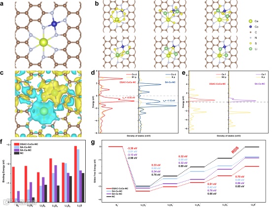 基于密度泛函理论计算,本研究从原子尺度揭示了Co/Ce双单原子的协同作用机制:电子由Ce位点向Co位点转移,诱导Co的d带中心上移,共同增强了催化剂对多硫化物的吸附能力。Ce位点因其对长链多硫化物的强吸附性主导初始捕获,而Co位点则有效催化后续固相Li2S的沉积/解离关键步骤,显著降低了相应反应的吉布斯自由能垒。同时,该双位点结构亦能促进Li⁺传输。综上,Co/Ce通过“吸附-转化”协同机制,抑制多硫化物穿梭并加速反应动力学,从而显著提升锂硫电池性能。