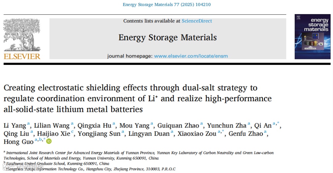 基于此,云南大学国际先进能源材料联合研究中心的研究团队在《Energy Storage Materials》期刊上发表了一篇题为“Creating electrostatic shielding effects through dual-salt strategy to regulate coordination environment of Li+ and realize high-performance all-solid-state lithium metal batteries”的研究论文,提出了一种通过双盐策略创造静电屏蔽效应的方法,成功解决了全固态锂金属电池中锂离子沉积不均匀的问题,为高性能全固态锂金属电池的研发提供了新思路。