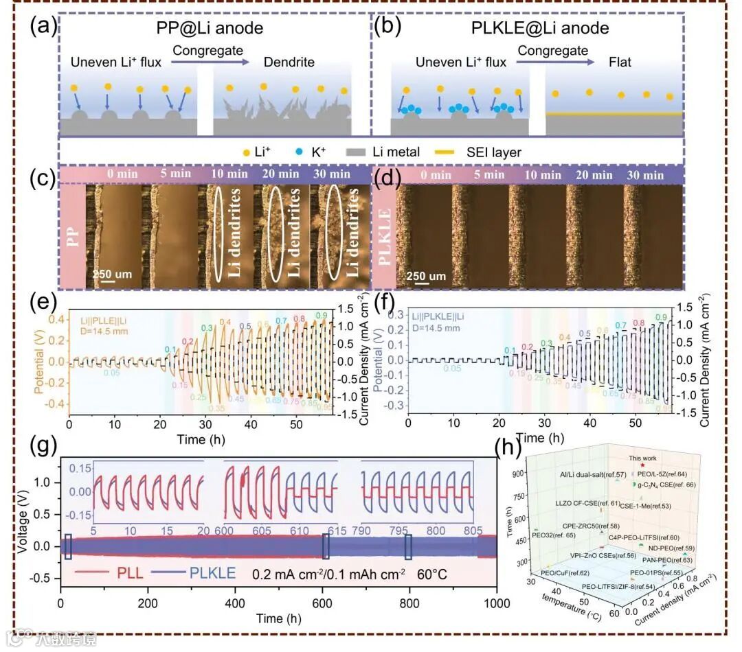 Fig. 3. Schematic diagram of dendrite growth principle of a) Li/PP/Li and b) Li/PLKLE/Li cells. Optical microscopy observation of the Li plating in c) Li/PP/Li and d) Li/PLKLE/Li. Critical current density of e) Li/PP/Li and f) Li/PLKLE/Li. g) Galvanostatic cycling performance and enlarged view of Li/PLL/Li and Li/PLKLE/Li at 0.2 mA cm−2. h) Cyclic performance comparison diagram.