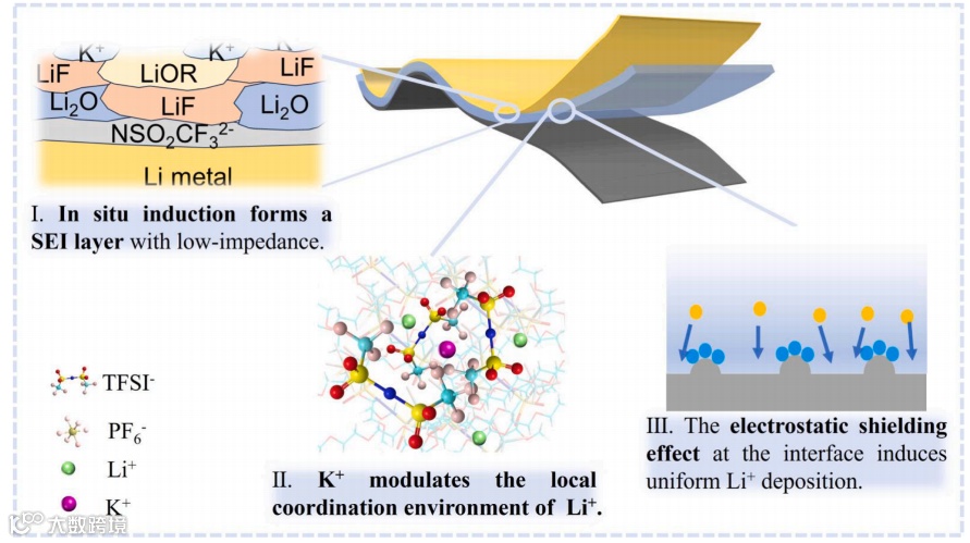 通过直接向复合固态电解质中引入K+的方法构建双盐聚合物固态电解质。由于在低浓度下的K+有比Li+更低的有效还原电位,因此在充放电过程中K+倾向于在界面处聚集,产生静电屏蔽效应,引导Li+均匀沉积。此外,K+与TFSI-和Li+之间的竞争配位作用促进了TFSI-和PF6-的原位分解,形成富含LiF-Li3N-Li2O的低阻抗SEI层。