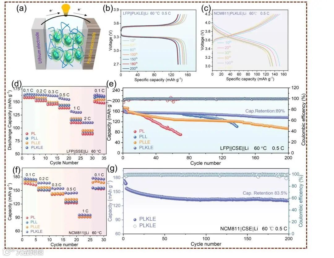 Fig.4. a) Battery cycle diagram. Charge and discharge curves of b) LFP/PLKLE/Li and NCM811/PLKLE/Li during cycling. d) Rate performance of LFP/PLKLE/Li. e) Cycle performance of LFP/PLKLE/Li. f) Rate performance of NCM811/PLKLE/Li. g) Cycle performance of NCM811/PLKLE/Li.