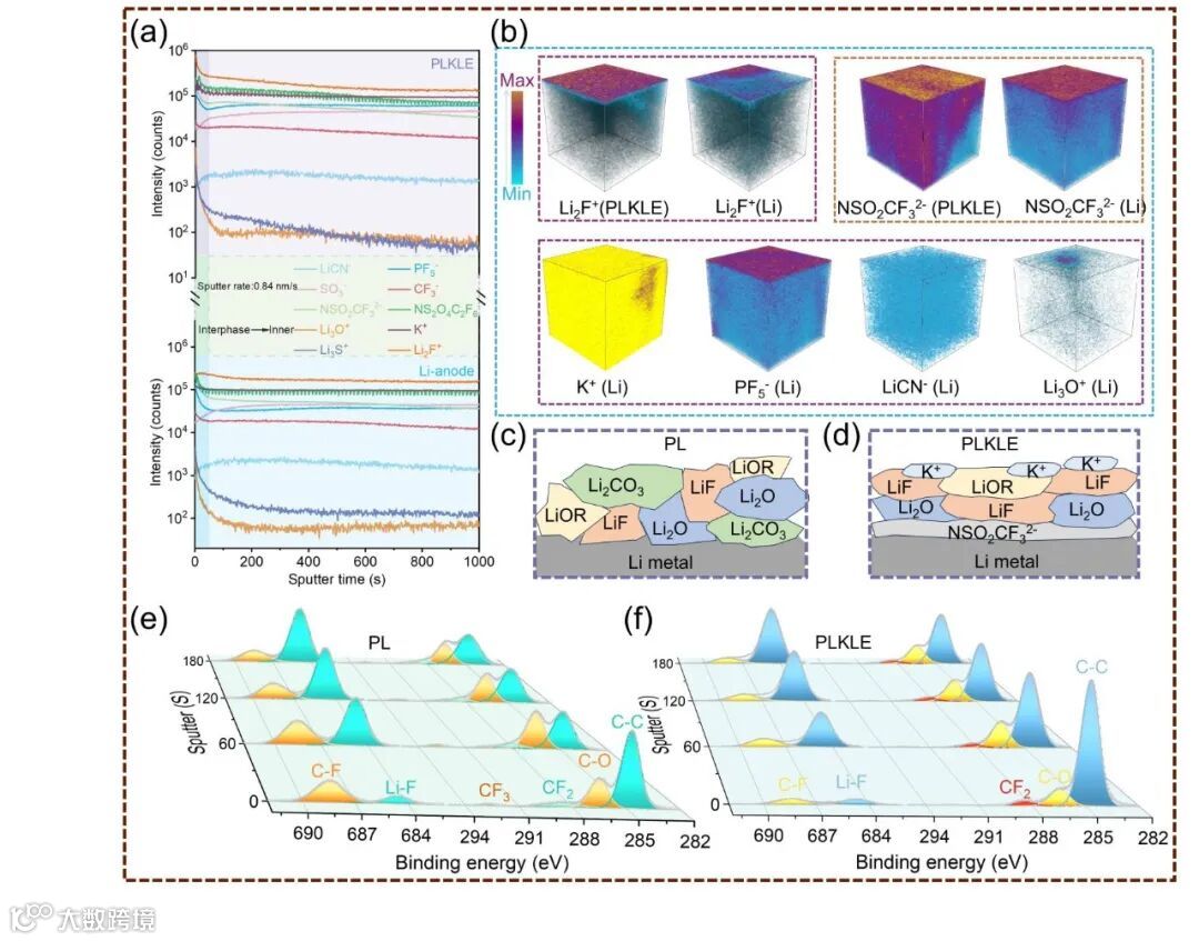 Figure 5. a) TOF-SIMS depth profiles for the cycled PLKLE and the corresponding cycled Li anode. b) 3D view of fragments (Li2F+, NSO2CF32−) distribution of cycled PLKLE and corresponding Li anode, and 3D view of ions (K+) and some decomposition products (PF5-, LiCN−, and Li3O+) distribution of cycled Li anode. Schematic diagram of SEI material composition on the surface of lithium negative electrode of c) PL and d) PLKLE. e) F 1s and C 1s XPS spectra of cycled Li anode of Li/PL/Li. f) F1s and C1s XPS spectra of cycled Li anode of Li/PLKLE/Li.