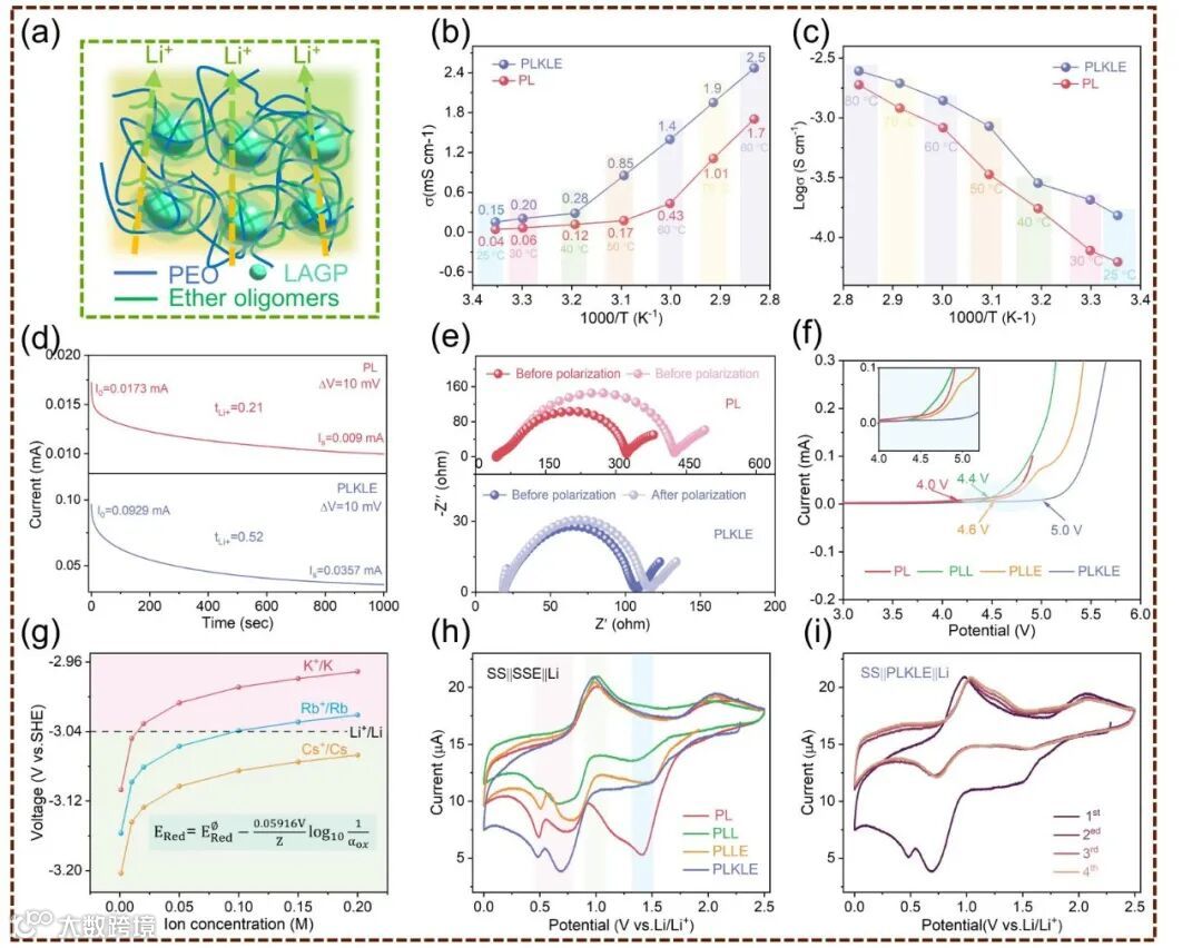Fig. 2. a) Schematic diagram of lithium ion transport inside electrolyte. b) Curves of ionic conductivities with temperature of PL and PLKLE, and c) the corresponding Arrhenius plots. d) Direct current polarization curves of PL and PLKLE, and e) the corresponding Nyquist plots. f) LSV plots of CSEs. g) The change of redox potential of K+/K, Rb+/Rb, and Cs+/Cs. h) First-cycle of Li/CSE/SS. i) CV curves of Li/PLKLE/SS cell.