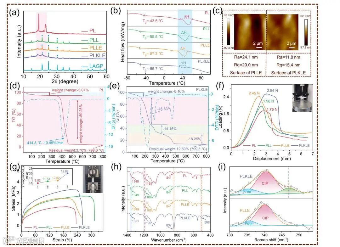 Fig. 1. a) XRD patterns of CSEs. b) DSC curves of PL, PLL, PLLE, and PLKLE. c) AFM deformation images of PLLE and PLKLE. TG curves of d) PL and e) PLKLE. f) Puncture curves of CSEs. g) Stress-strain curves of CSEs. h) FT-IR spectra for retrieving conformations of PL, PLL, PLLE, and PLKLE. i) Raman spectra of PLLE and PLKLE.