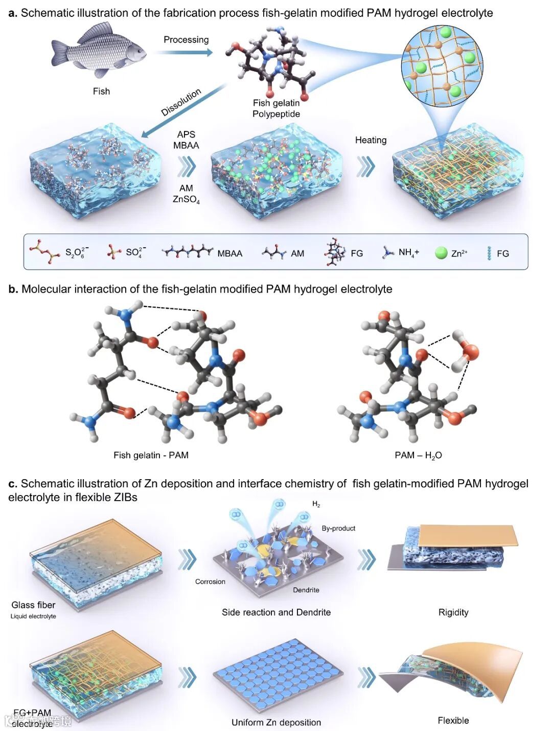 图1. (a)鱼蛋白胶改性PAM水凝胶电解质的制备过程示意图;(b)鱼蛋白胶改性PAM水凝胶电解质中的分子相互作用;(c)柔性蛋白胶电池中改性PAM水凝胶电解质中锌沉积和界面化学的示意图。