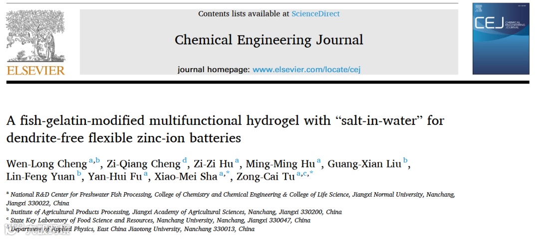 近日,来自江西师范大学的涂宗财、沙小梅教授,在国际知名期刊Chemical Engineering Journal上发表题为“A fish-gelatin-modified multifunctional hydrogel with “salt-in-water” for dendrite-free flexible zinc-ion batteries”的研究文章。该研究提出以鱼蛋白胶修饰聚丙烯酰胺水凝胶电解质,通过强氢键作用增强其机械性能和界面稳定性,有效抑制锌枝晶生长与副反应,改善锌沉积行为。应用于柔性锌离子电池中,实现了长循环寿命与优异容量保持率,为高性能可穿戴储能器件提供了简洁高效的新策略。