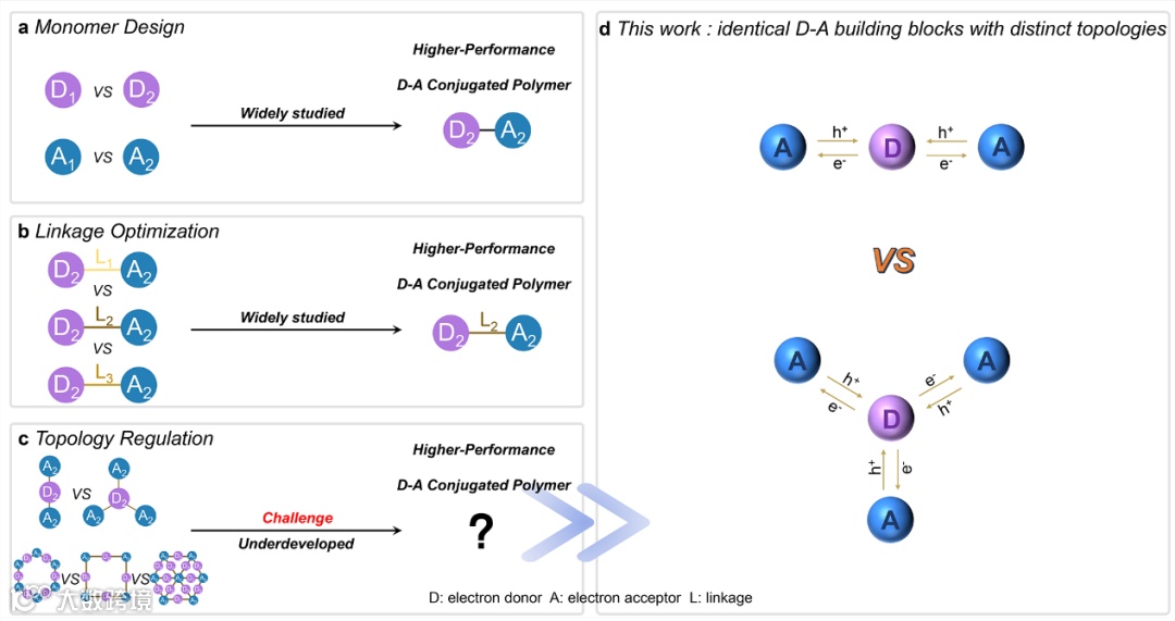 图 1. a-c)设计高性能D-A共轭聚合物光催化剂的单体设计、连接键优化和拓扑调控策略的示意图。d)本研究的设计原理示意图。
