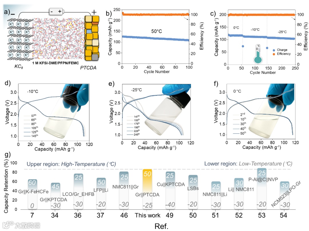 图6. 钾离子全电池:(a) Gr||PTCDA全电池的示意图;(b) 50 ℃下的循环性能;(c) 不同温度下的循环性能;在0 ℃ (d),-10 ℃ (e)和-25 ℃ (f)温度下的电池充放电曲线;(g) 低温性能对比。
