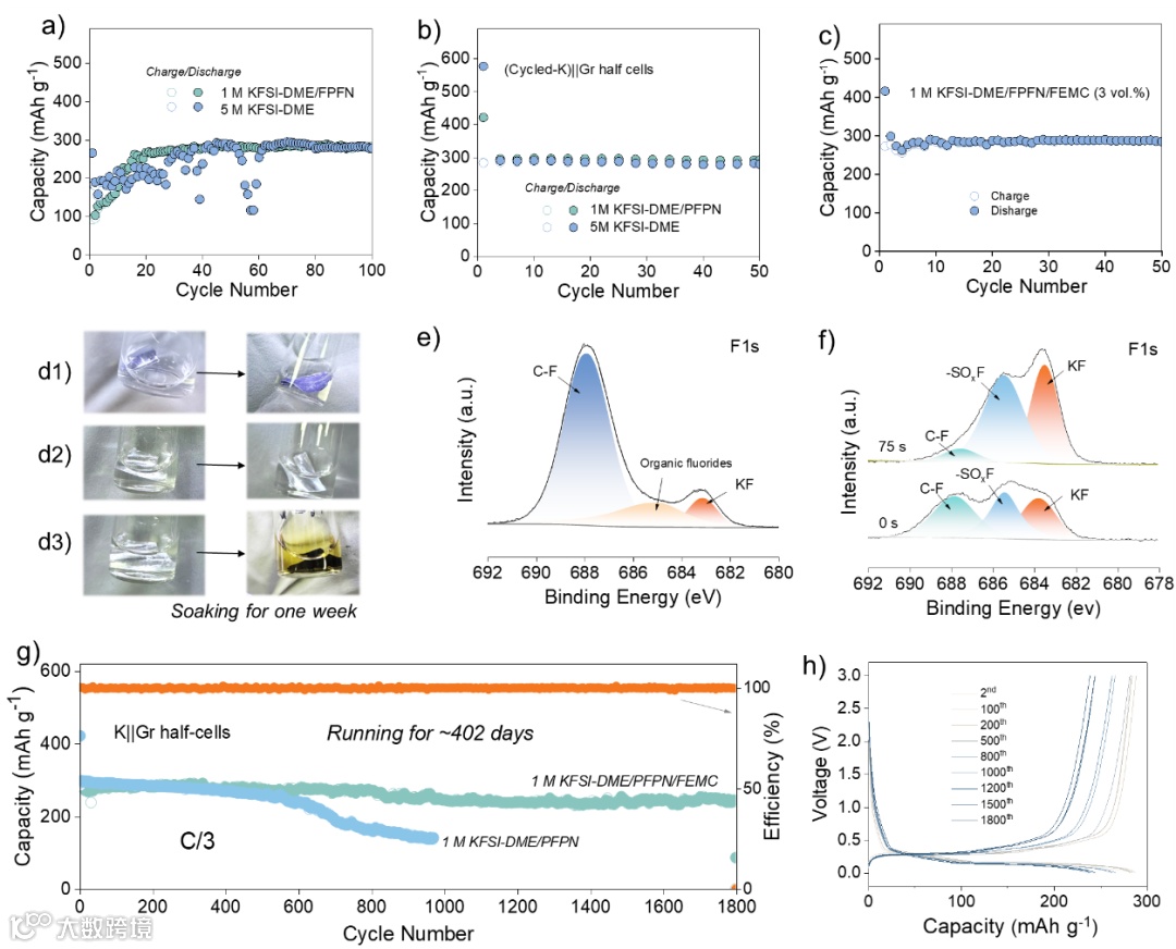 图4. 电解液与石墨负极的兼容性:(a) “新鲜”的钾金属(b)循环后的钾金属作为对称电极组装K||Gr半电池的循环稳定性;钾金属浸泡在(d1) 1 M KFSI-DME/PFPN,(d2)1 M KFSI-DME/PFPN/FEMC (3 vol%)(d3)1 M KFSI-DME/PFPN/FEMC (5 vol%) 电解液中浸泡一周后照片;(e)在1 M KFSI-DME/PFPN/FEMC (5 vol%) 电解液中浸泡一周后钾金属的F1s XPS光谱;(f) 200圈循环后的石墨负极的F1s XPS深度剖析测试;(g)K||Gr半电池的长期循环稳定性和(h)对应的充放电曲线。