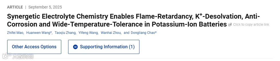 现代社会对能源存储的高要求,促使科研界积极探索更具可持续性的新型二次电池体系。钾离子电池(PIBs)因钾资源储量丰富、K+/K低还原电位(-2.93 V)以及与商业化石墨负极的高度兼容性而备受关注。然而,传统碳酸酯电解液中,PIBs面临枝晶生长、界面腐蚀、低温性能差等严峻挑战,严重阻碍了其商业化进程。现有的高浓度电解液虽可一定程度缓解K⁺与溶剂的强配位作用,抑制溶剂共嵌问题,但其成本高、黏度大、传导性差,不利于规模化应用;而传统低浓度醚类电解液虽然离子传导性好,但存在易燃、腐蚀严重等安全隐患。针对上述问题,中国地质大学与复旦大学团队在本工作中提出了协同电解液化学(Synergetic Electrolyte Chemistry)策略,在1 M KFSI-DME低浓度体系中引入乙氧基五氟环三磷腈(PFPN)和三氟乙基甲基碳酸酯(FEMC)两种功能分子,前者通过空间位阻效应削弱K⁺-DME配位、促进K⁺去溶剂化并赋予电解液优异的阻燃性能,后者在低电位下优先分解生成富含KF的稳定SEI层,有效抑制钾枝晶与腐蚀反应,从而在阻燃性、低温传导性与循环稳定性之间实现了完美平衡。得益于此,K||Gr半电池循环1800圈后容量保持率仍达86.5%,运行时间超过400天,性能媲美商用锂离子电池;在-20 ℃下容量保持率高达89%,展现出优异的低温适应能力;同时PFPN赋予电解液自熄灭特性,显著提升了电池安全性。该研究首次在低浓度醚类电解液中通过多功能分子协同设计同时解决了阻燃、安全、低温与长循环寿命的难题,为钾离子电池的大规模储能应用提供了新的电解液化学设计思路。论文题目为“Synergetic Electrolyte Chemistry Enables Flame-Retardancy, K⁺-Desolvation, Anti-Corrosion and Wide-Temperature-Tolerance in Potassium-Ion Batteries”,已发表于J. Am. Chem. Soc. (JACS)。论文的第一作者是毛志飞博士,通讯作者是王欢文教授和晁栋梁教授。