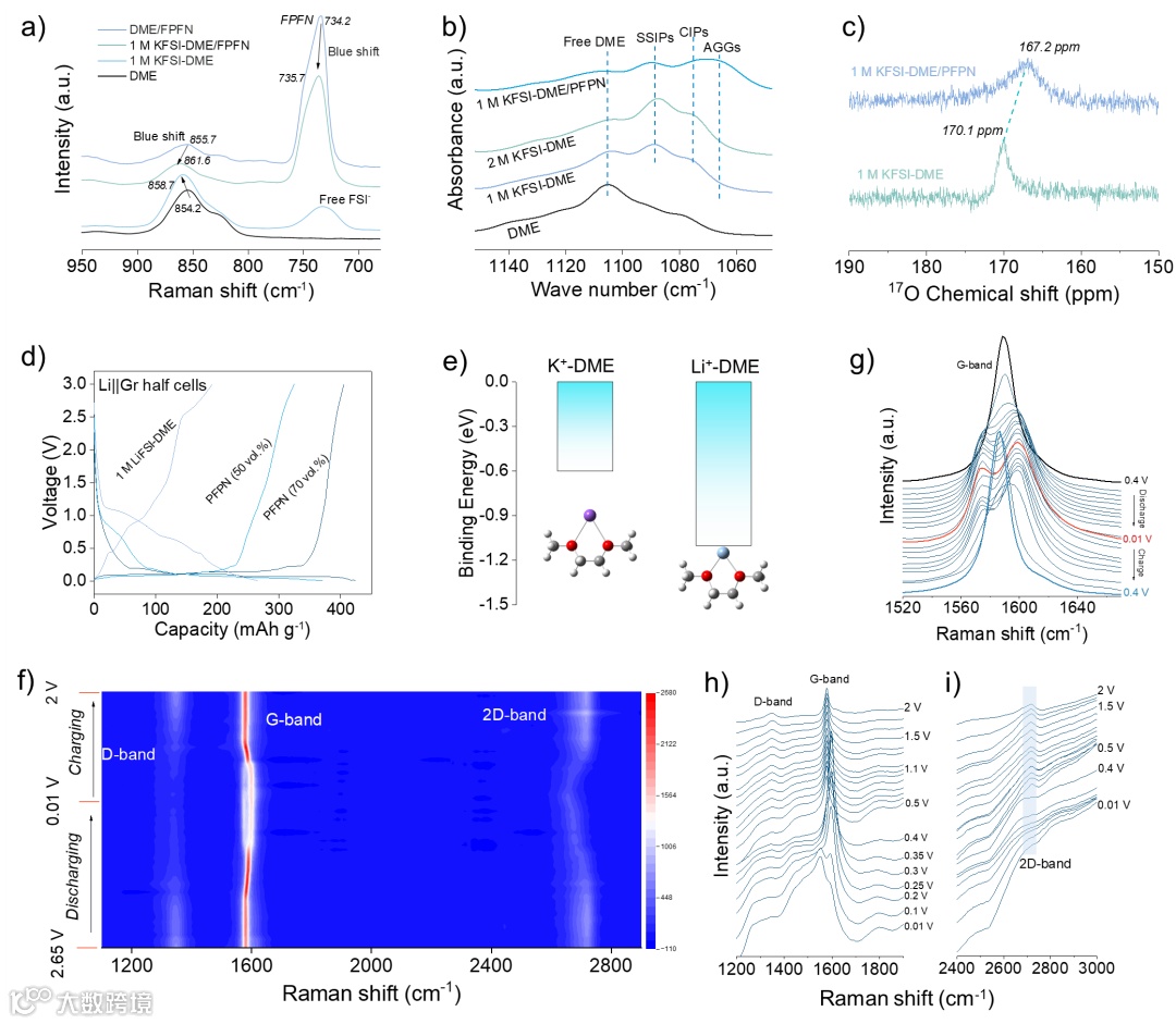图3. 电解液结构和锂离子电池体系对比。(a) DME和DME/PFPN基电解液的拉曼光谱;(b) 各种电解液的FTIR光谱;(c)电解液的17O NMR光谱;(d)Li||Gr半电池在0.5 C下的充放电曲线。倍率性能对比图;(e) Li+-DME和K+-DME的结合能对比;石墨负极在(f-g)1 M KFSI-DME/PFPN/FEMC和(h-i)1 M KFSI-DME电解液中的原位拉曼光谱。