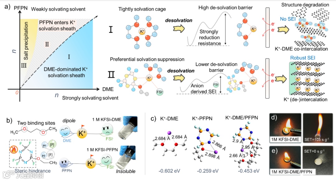 图1.电解液设计。(a)强溶剂化溶剂DME和弱溶剂化溶剂PFPN与K+配位关系示意图(K+被DME形成的紧密溶剂化鞘层“捕获”,导致K+-溶剂共插层石墨;逐渐提升PFPN含量改变了DME主导的溶剂化结构,使得PFPN和阴离子FSI-能够有机会进入到第一层溶剂化鞘层。从而降低了K+去溶剂化能垒并由此形成了FSI-衍生的强健的SEI);(b)两种溶剂的溶剂化能力对比。(c)结合能和结合位点到的距离。(d)1 M KFSI-DME和 (e)1 M KFSI-DME/PFPN/FEMC电解液的燃烧性测试。